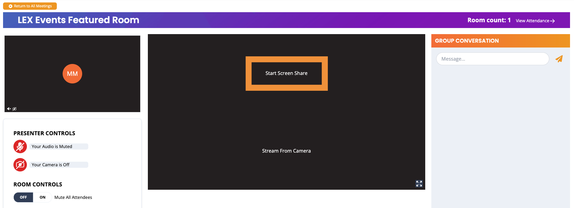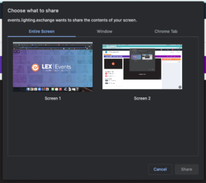 It’s extremely easy to share your screen in LEX Events! Simply click on the white text “Start Screen Share” in the center of your screen. When you click on this text, a pop-up window will appear, guiding you to choose what you would like to share (see below). You have the option to share your entire screen, a browser window or computer application, or a single browser tab.